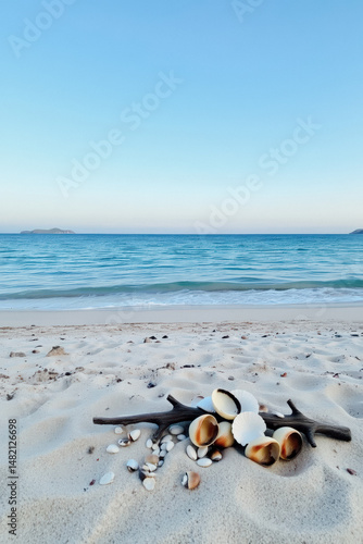 © Evgenii Starkov, Naklejka premium Seashells Clustered on a Beach Branch