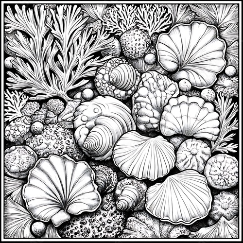 © Indronath, Fototapeta premium Seashells coral ocean scene coloring page background