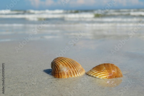 © natalya2015, Obraz premium Seashells on ocean background in Atlantic coast of North Florida