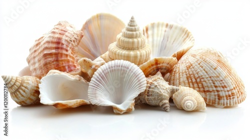 © Pixcellence, Obraz premium Seashells on White Background: Collection of Ocean Treasures