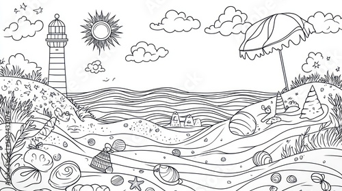 Naklejka premium Seaside coloring page, lighthouse, beach, sun, umbrella. Coloring book, relaxing, kids, nature, summer