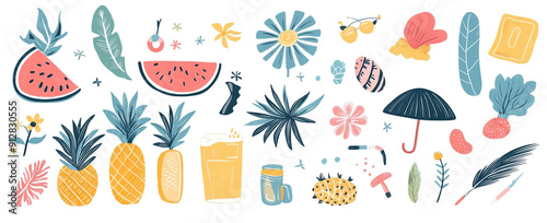 Fototapeta premium Seaside Doodles: A Fun and Playful Set of Summer Elements and Vacation Icons,...