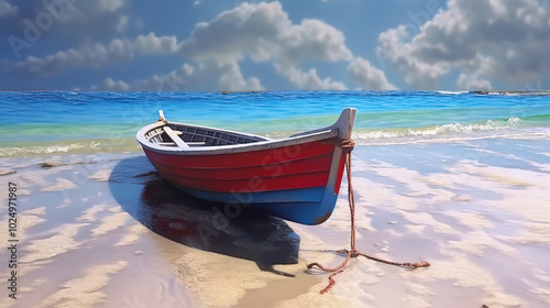 © Mukhlesur, Naklejka premium Seaside Serenity A Fishing Boat Anchored on the Beach Awaiting the Tide
