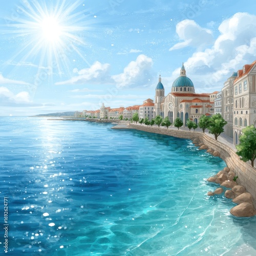 Fototapeta premium Seaside Town Illustration: Coastal Architecture, Sunlit Waters, and Blue Skies