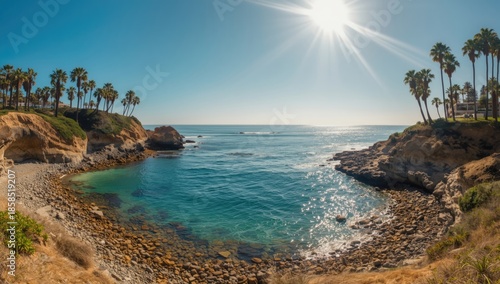 © pngking, Fototapeta premium Seaside view at La Jolla Cove featuring rocky cliffs, tide pools, palm trees, and bright blue skies, emphasizing erosion risk