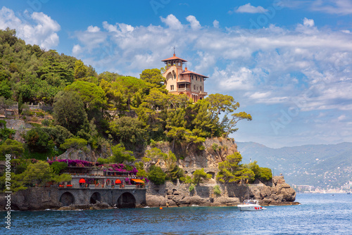 © Kavalenkava, Obraz premium Seaside villa on rocky cliff surrounded by trees in Portofino, Italy, Liguria region