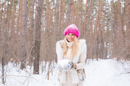 Fototapeta premium Season and people concept - Attractive blond woman dressed in white coat and pink hat standing in winter snowy park