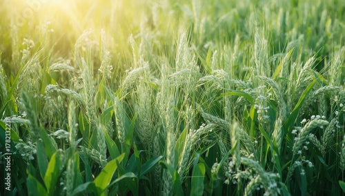 © The 2R Artificiality, Obraz premium Seasonal fresh green grains in a field during early warm months, showcasing nature's beauty with leaves and agriculture