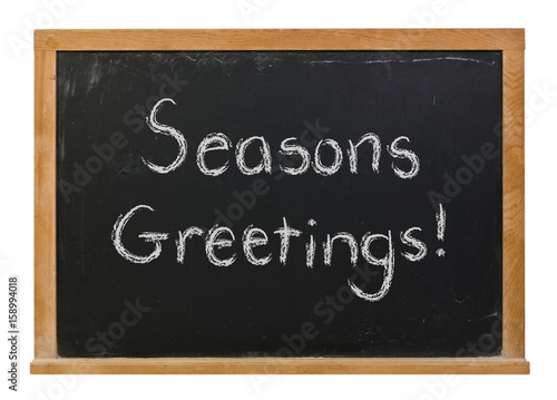 Obraz premium Seasons Greetings written in white chalk on a black chalkboard isolated on white