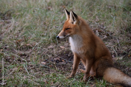 Fototapeta premium seated fox is resting and looking around while hunting for prey. photo was made in the Amsterdam Waterleidingduinen in the Netherlands