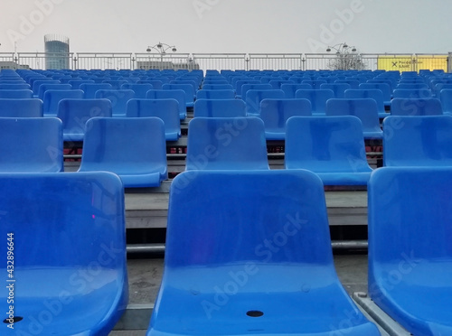 Naklejka premium Seats at the stadium. shallow depth of field. Empty blue seats in a row at...
