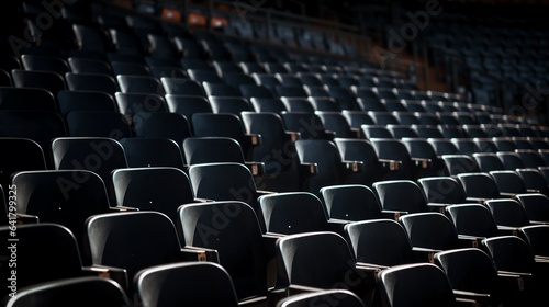 Naklejka premium Seats of black tribune on sport stadium. empty outdoor arena. concept of fans. chairs for audience. cultural environment concept. color and symmetry. empty seats. modern stadium