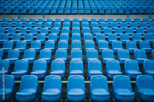 Fototapeta premium Seats of blue tribune on sport stadium. empty outdoor arena. concept of fans. chairs for audience