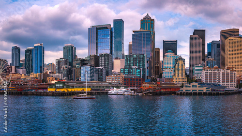 Obraz premium Seattle city skyline, dramatic cloudscape over Elliot Bay in Washington State