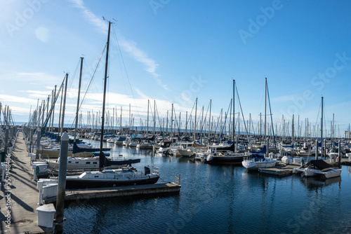 Fototapeta premium Seattle, Washington local harbor with lots of boats at docks and moorings
