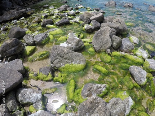 © AnneLina, Fototapeta premium Seaweed covered rocks