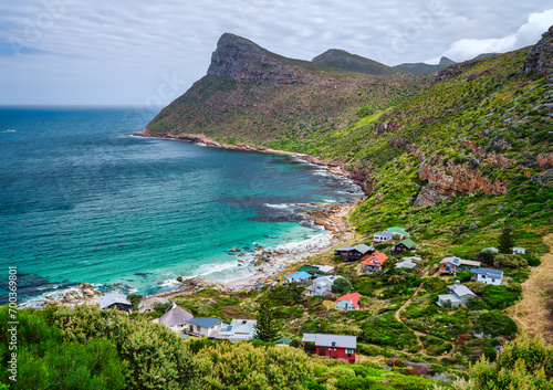 © Arnold, Fototapeta premium Secluded beach village of Smitswinkel Bay with turquoise water surrounded mountain, cape peninsula, Cape Town, South Africa