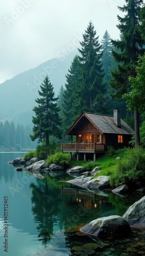 Fototapeta premium Secluded cabin amidst lush greenery at lakefront, forest, cabin