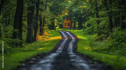 © Fenny, Obraz premium Secluded cabin at the end of a forest road.