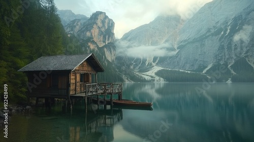 © Nuris, Fototapeta premium Secluded Cabin by a Mountain Lake
