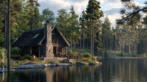 © Erna yuliyanti, Fototapeta premium Secluded Cabin by the Lake
