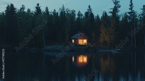 © Mahavira Osa, Fototapeta premium Secluded Cabin by the Lake at Dusk