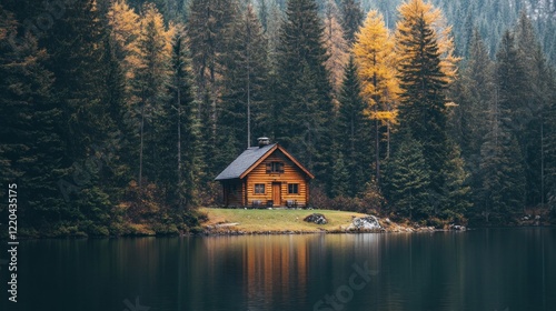 © Fikri, Fototapeta premium Secluded Cabin by the Lake in the Autumn Woods
