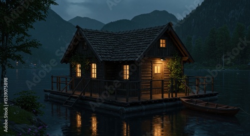© Asgar, Fototapeta premium Secluded cabin glows amidst mountains lake