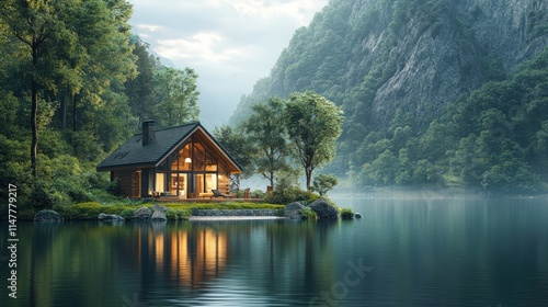 © Ali, Fototapeta premium Secluded cabin, lake, mountains, forest.