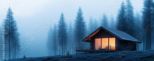 © Design@22, Fototapeta premium Secluded cabin, nestled in foggy woods, warm light, 3D illustration