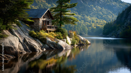 © Noon, Fototapeta premium Secluded cabin overlooking mountain lake with peaceful reflection
