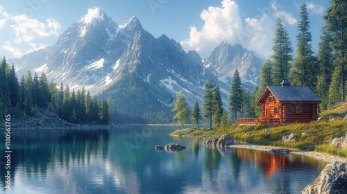 Naklejka premium Secluded cabin, tranquil lake, majestic mountains.