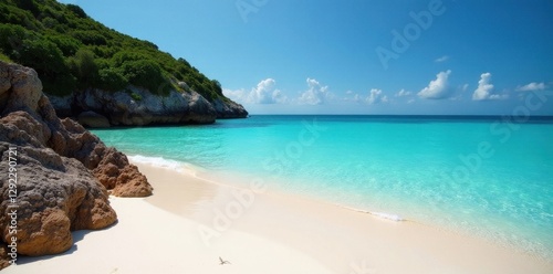 Fototapeta premium Secluded cove, powdery sand, crystal-clear water, vibrant coral , tropical...