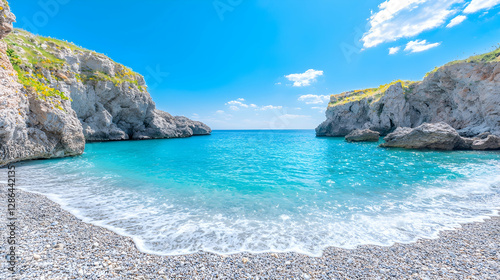 Fototapeta premium Secluded cove, turquoise water, pebble beach, sunny day, travel brochure