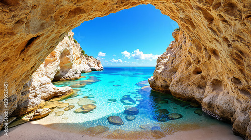© ABDELILAH, Fototapeta premium Secluded Cove, Turquoise Waters, Sandy Beach, Rock Formations, Sunny Day, Island Paradise, Mediterra