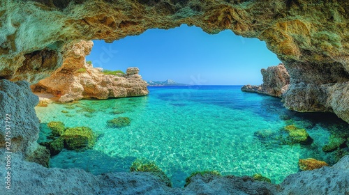 Fototapeta premium Secluded cove viewed from cave, turquoise water, sunny day, island background, travel brochure