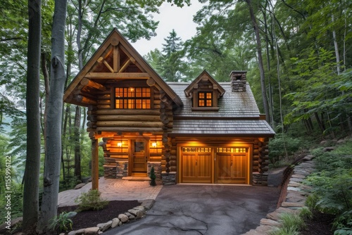 © Vlad, Naklejka premium Secluded Forest Cabin with Attached Garage: A Rural Retreat Amidst Nature's Splendor