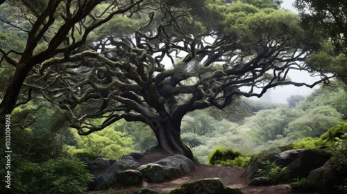 © NFTNexus, Fototapeta premium Secluded Lawsonia inermis Tree with Intricate Branches Surrounded by Lush Greenery in Misty Landscape