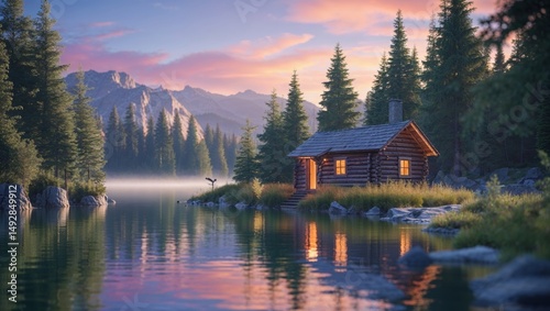 © yarku20, Naklejka premium Secluded log cabin on a tranquil lake at sunset. Warm light glows from inside, creating a peaceful atmosphere. Perfect for a relaxing getaway.