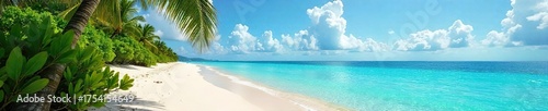 © Sunisa, Fototapeta premium Secluded Tropical Beach Paradise Lush Vegetation, Turquoise Waters, Deserted Island Escape