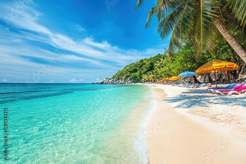 © Dimass, Fototapeta premium Secluded tropical beach with clear water and palm trees