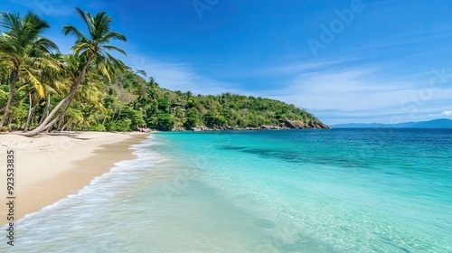 Naklejka premium Secluded Tropical Beach with Crystal-Clear Turquoise Water and Swaying Palm...