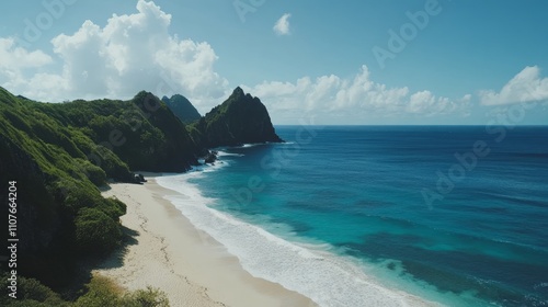 Fototapeta premium Secluded tropical beach with lush green cliffs and turquoise ocean under a...