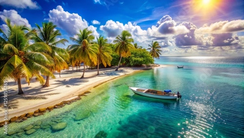 © kanda, Fototapeta premium Secluded Tropical Paradise A Picturesque Beach with Lush Palm Trees and Calm Turquoise Waters, Featuring a Small Boat at Anchor on a Sunny Day