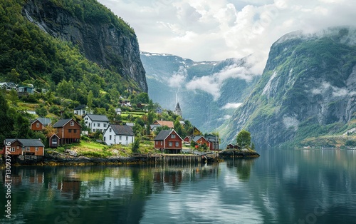 © Svitlana, Fototapeta premium Secluded Village Hidden Between Norwegian Fjord Cliffs
