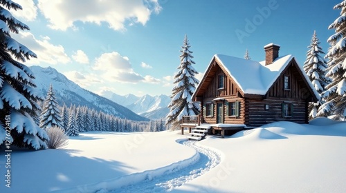 Fototapeta premium Secluded Wooden Cabin Nestled in a Snowy Mountain Landscape with a Winding Footpath Leading to its Entrance on a Bright Sunny Day