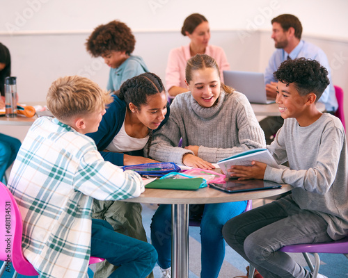 Fototapeta premium Secondary Or High School Students Collaborating In Study Area With Teachers...