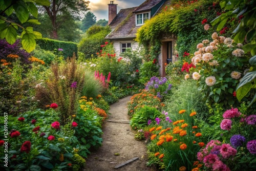 Naklejka premium Secret Garden Path: Blooming Flowers & Vintage House - Urban Exploration...