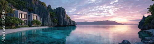 Naklejka premium Secret resort concept. Serene sunset view over tranquil waters and modern...