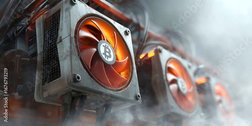 © Nonruedee, Fototapeta premium Secure Cryptocurrency Mining Farm with Glowing Servers and Advanced Cooling Systems